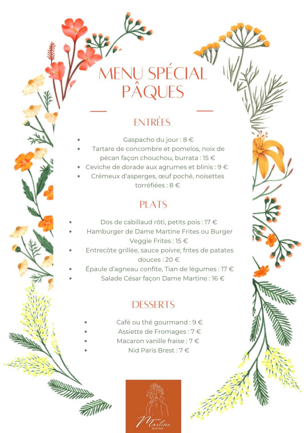 À l'occasion de Pâques, le restaurant Dame Martine à Abbeville vous accueille exceptionnellement le dimanche 5 avril 2026.